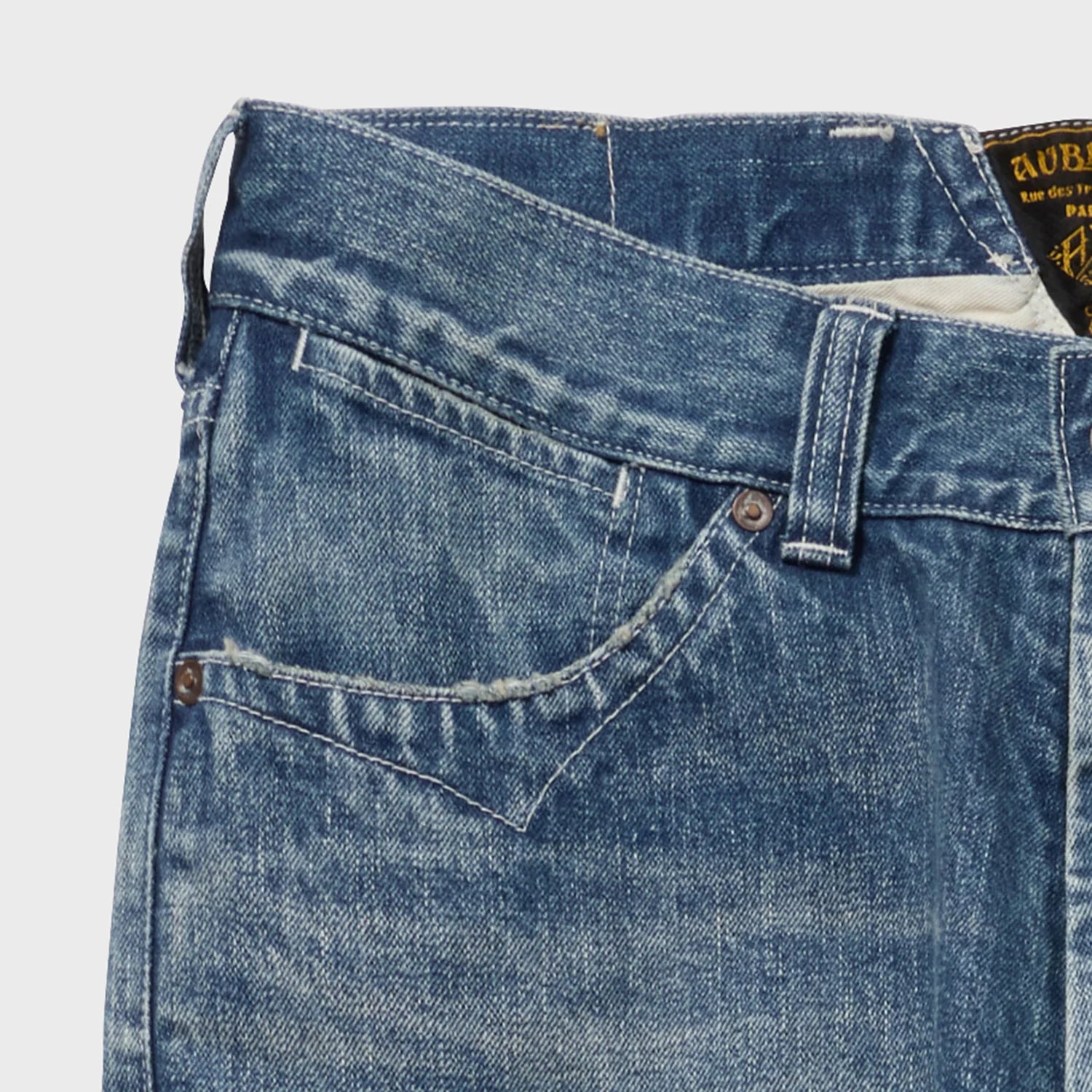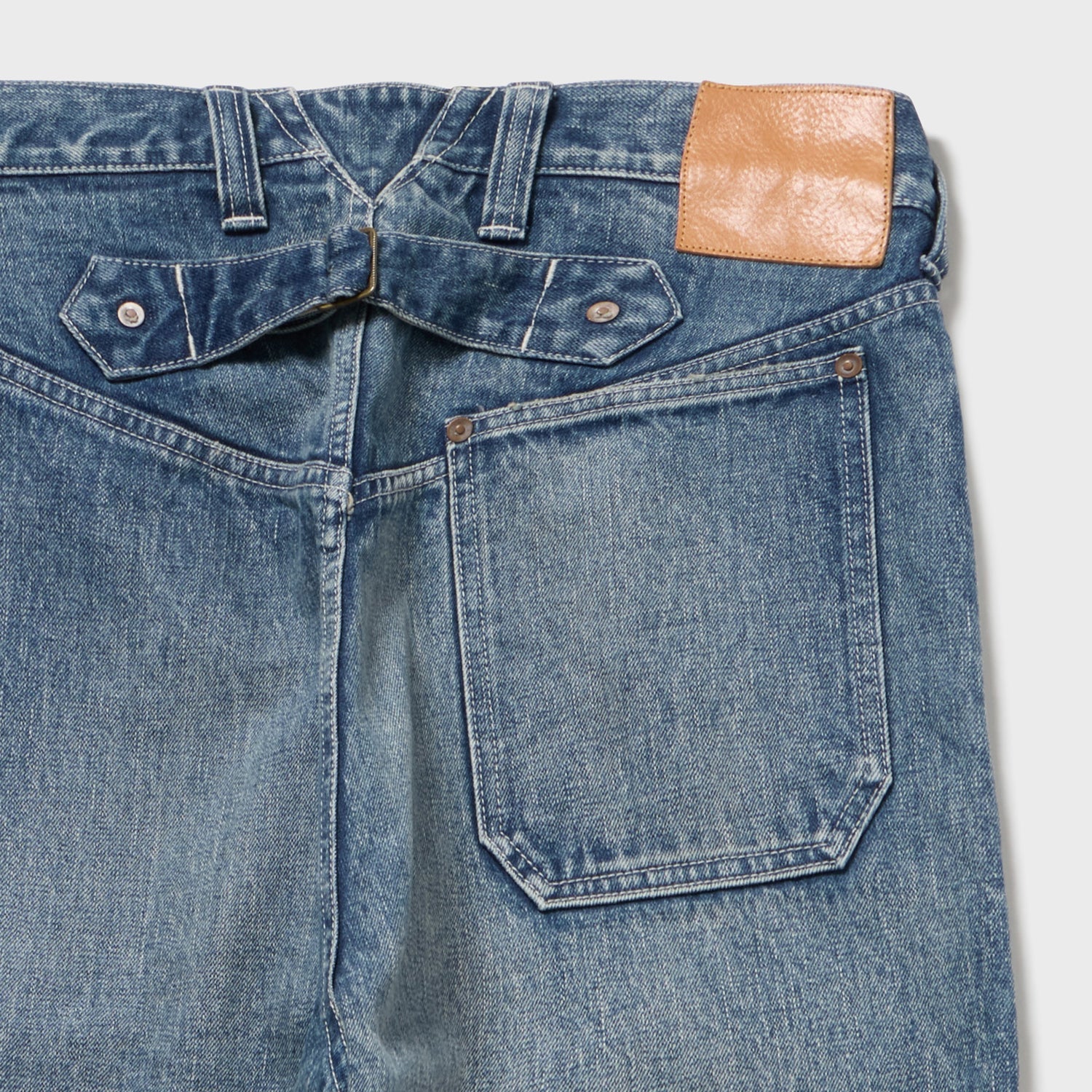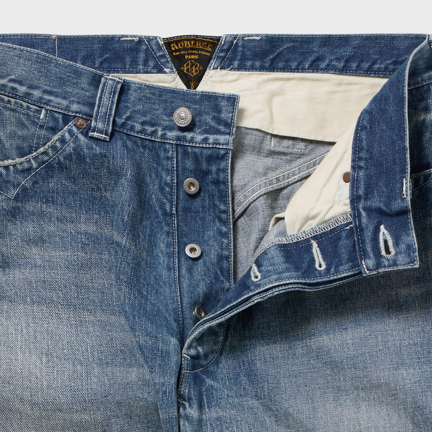 ベルジャルディ二エール社製のパンツをアレンジしたAUBERGE定番のフレンチワークパンツ。このシルエットとアメカジ感の強いデニムの組み合わせはコーディネイトの中に意外性をもたらします。