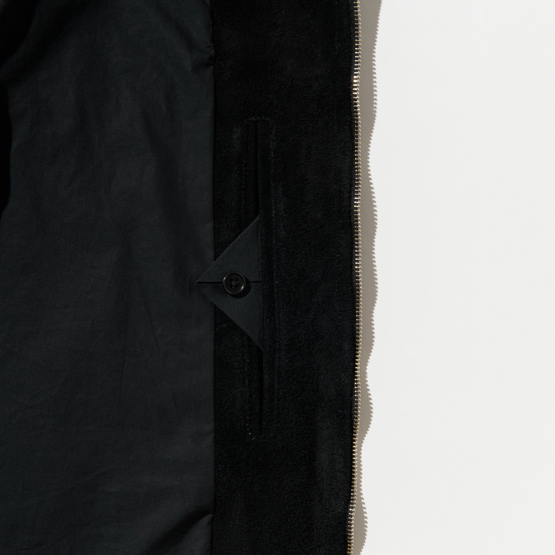 素上げの牛革にオイルを含ませてソフトに仕上げたスエードを使用。裾にはドローコードを配しシルエットの調節が可能です。