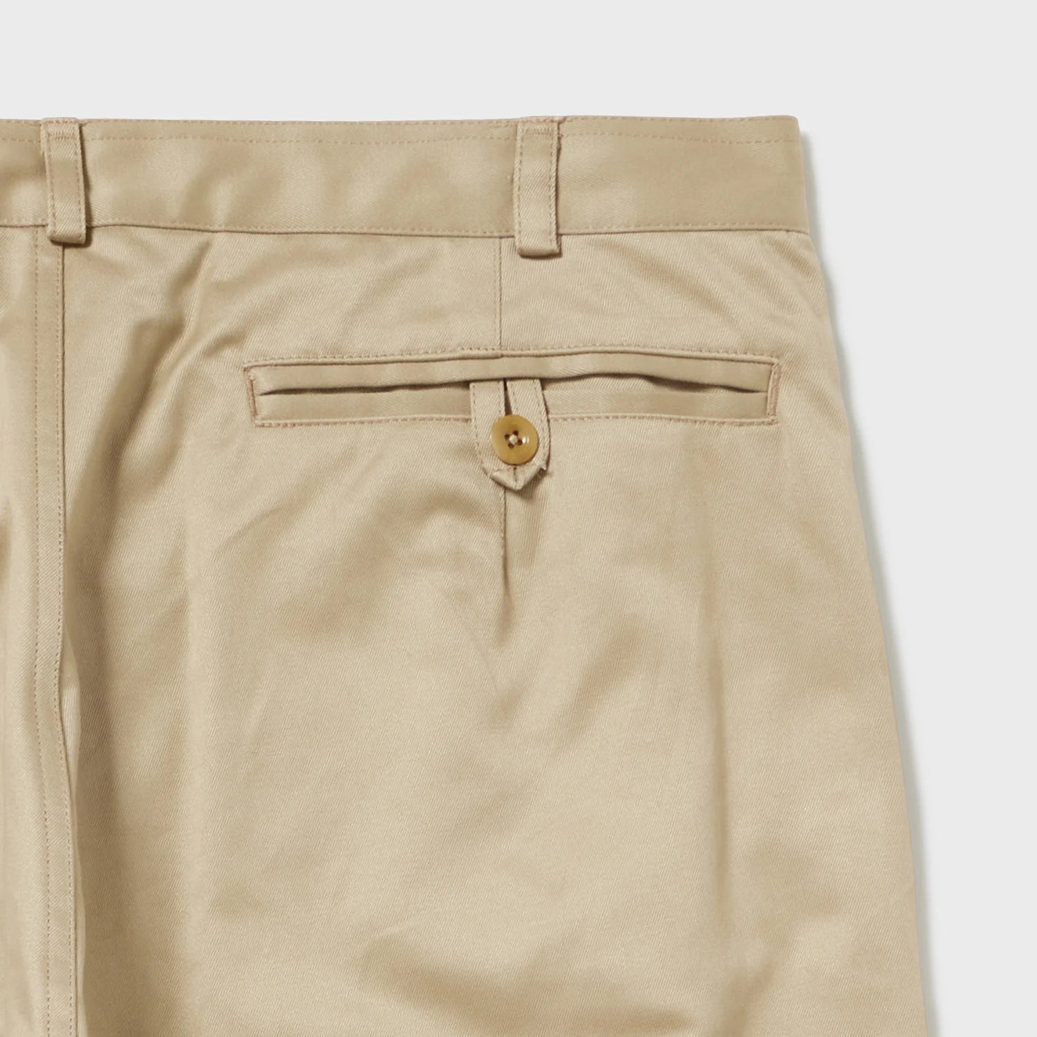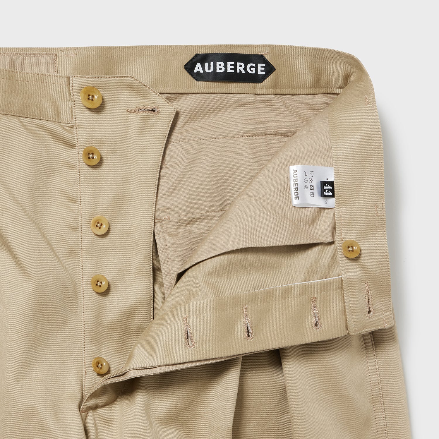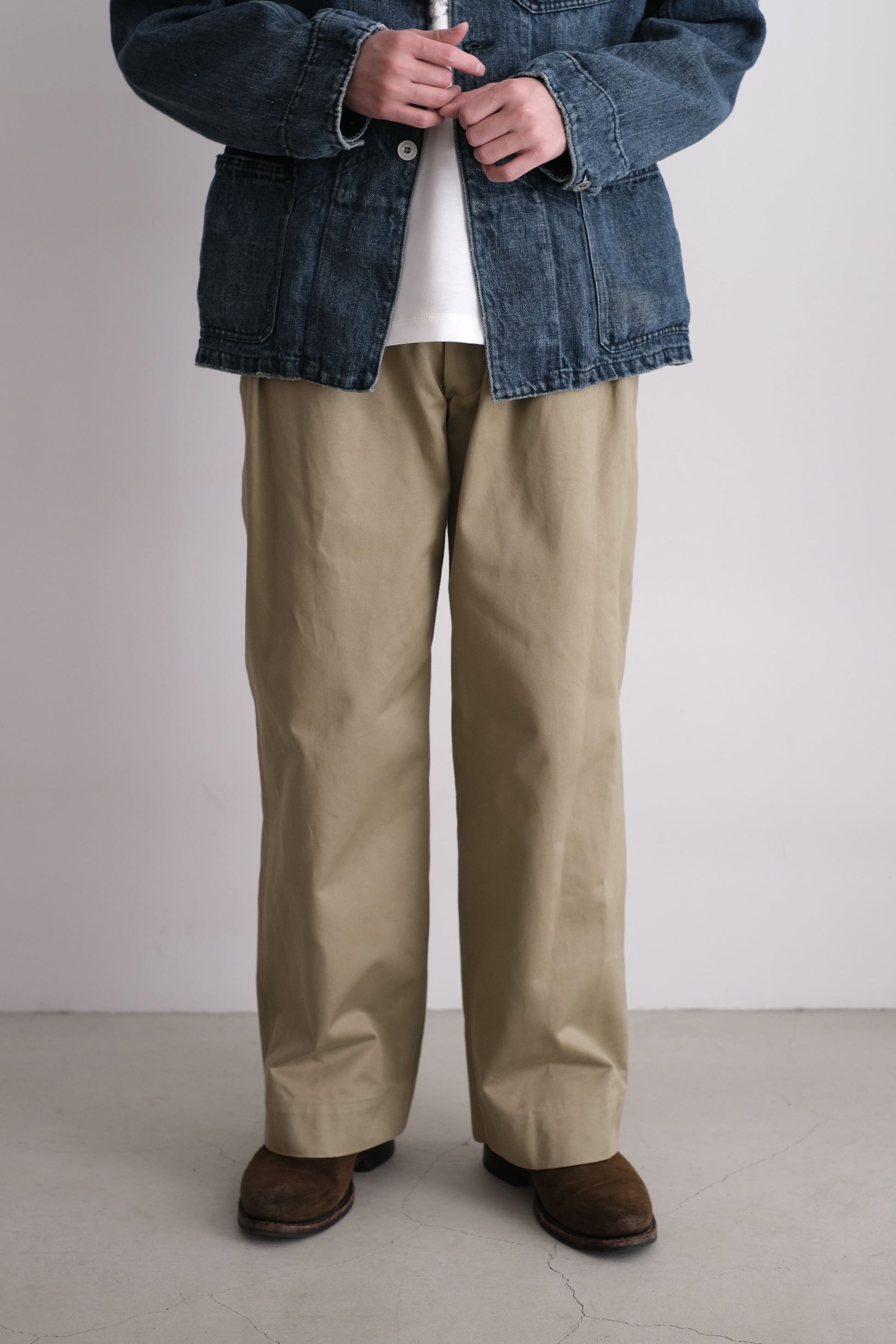 M52チノの初期型シルエットでワイドバギーなイメージにて製作されたこちらの1本。縦糸スビン、緯糸にマナプールにムラ糸を撚糸した壁撚り構造にすることで、高密度でありながら微妙な表面感を表現しております。