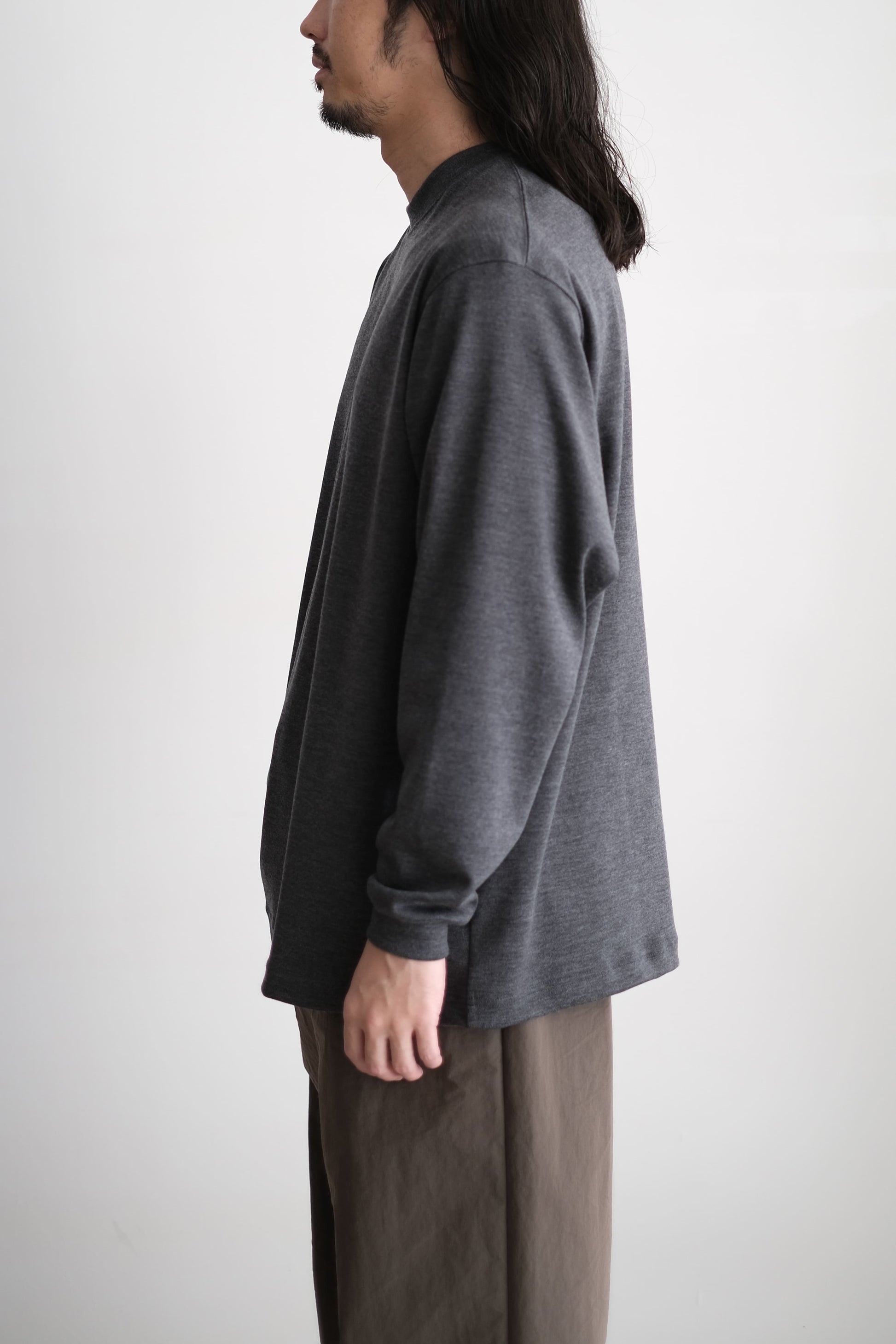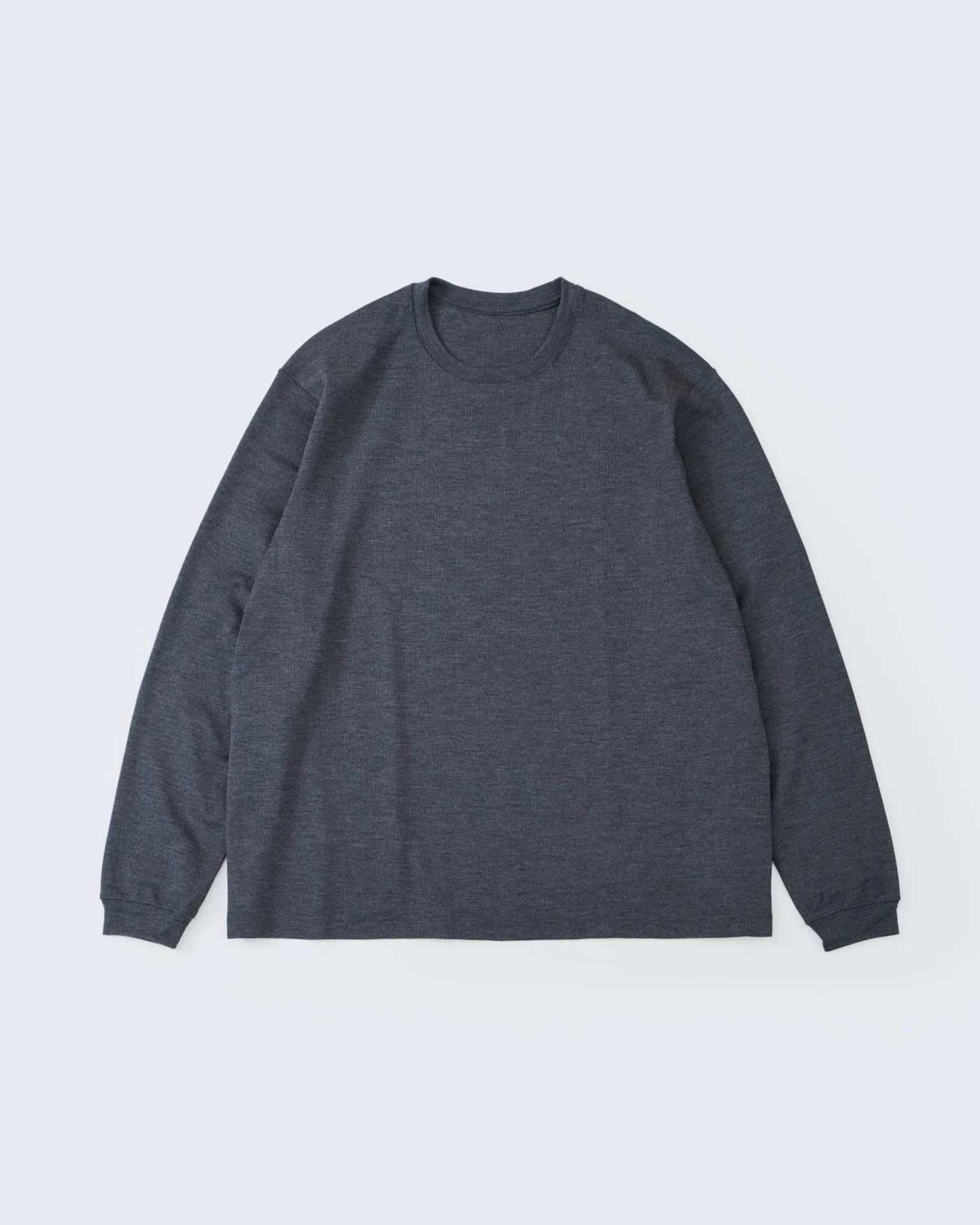 スウェットのような気軽さと、ニットならではの上質さをあわせ持つ一枚。メリノウール100%のフライス編みで仕立てたクルーネックニットです。素材にはスーパー120クラスの極細メリノウールを使用。やや厚みのあるしっかりとした生地感で、肌に触れるたびに柔らかく、安心感のある着心地です。吸湿性・放湿性に優れており、汗をかいても蒸れにくく快適。冷房の効いた室内や季節の変わり目にも適しており、春夏秋冬を問わず活躍します。自宅での洗濯が可能で、抗菌防臭性も備えているため、日常に取り入れやすく清潔感も保てます。一枚で着ても、ジャケットやニットのインナーとしても馴染む汎用性の高いニットに仕上がっております。