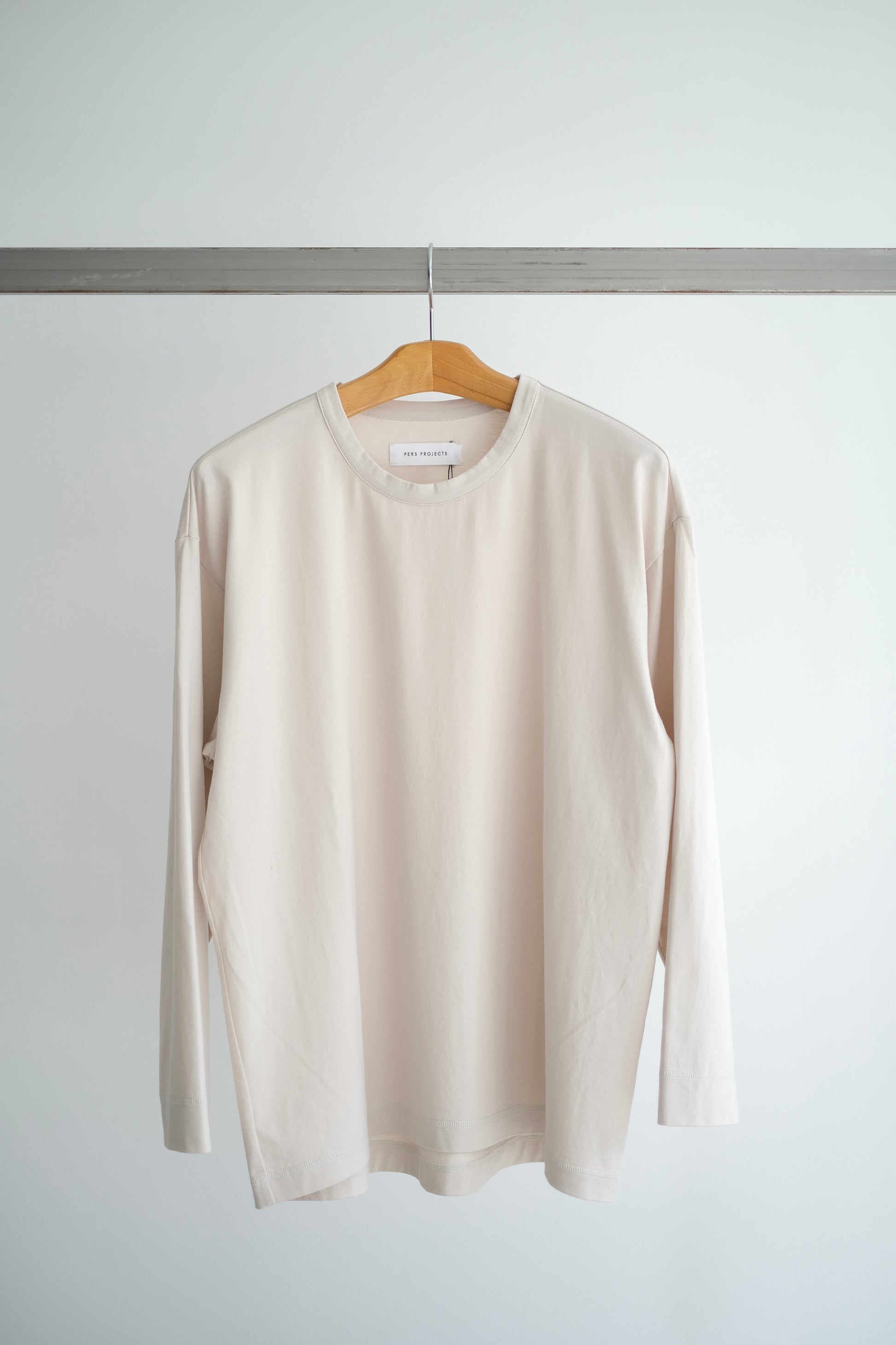 繊維長の長い超長繊維綿を使用し、加工により糸を締め仕上げた後に表面の毛羽を取り除いた天竺素材の長袖Tシャツ。上品な光沢感と程良い厚みがありながら滑らかでしっとりとした肌当りが特徴。衿は生地を4つ巻きで仕上げ、だれないようにし、袖付けはジャケットのような立体裁断を応用して付けられています。一枚着でも存在感が出るように程よくゆとりのあるサイズ感に仕上がっております。