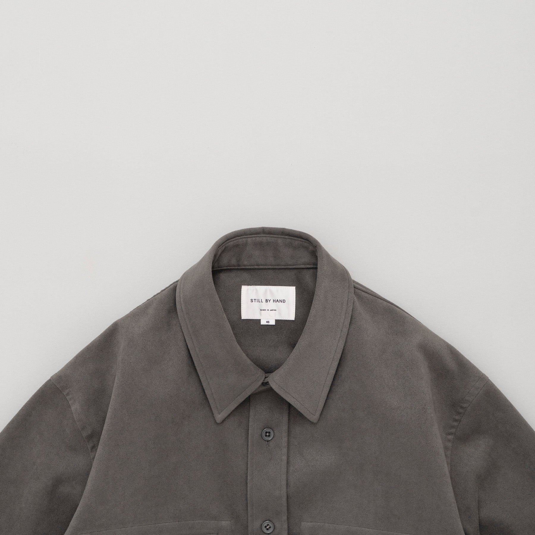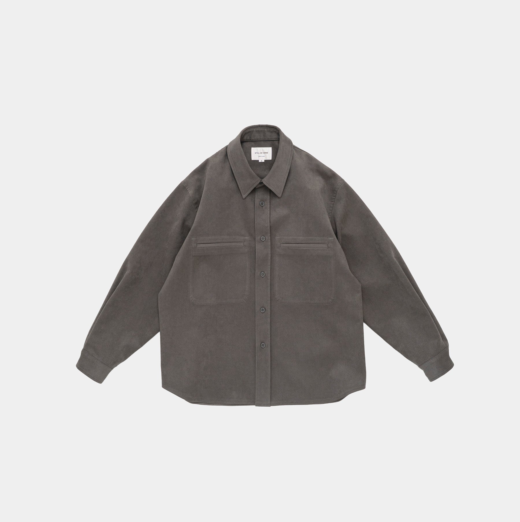 フェイクスエード素材を使用したWポケットのシャツジャケット。シャツデザインですがしっかりとした素材感ですのでジャケットとしても活用いただけます。パッチポケットではなく玉縁ポケットにすることでカジュアルさを抑えたデザインに仕上げています。
