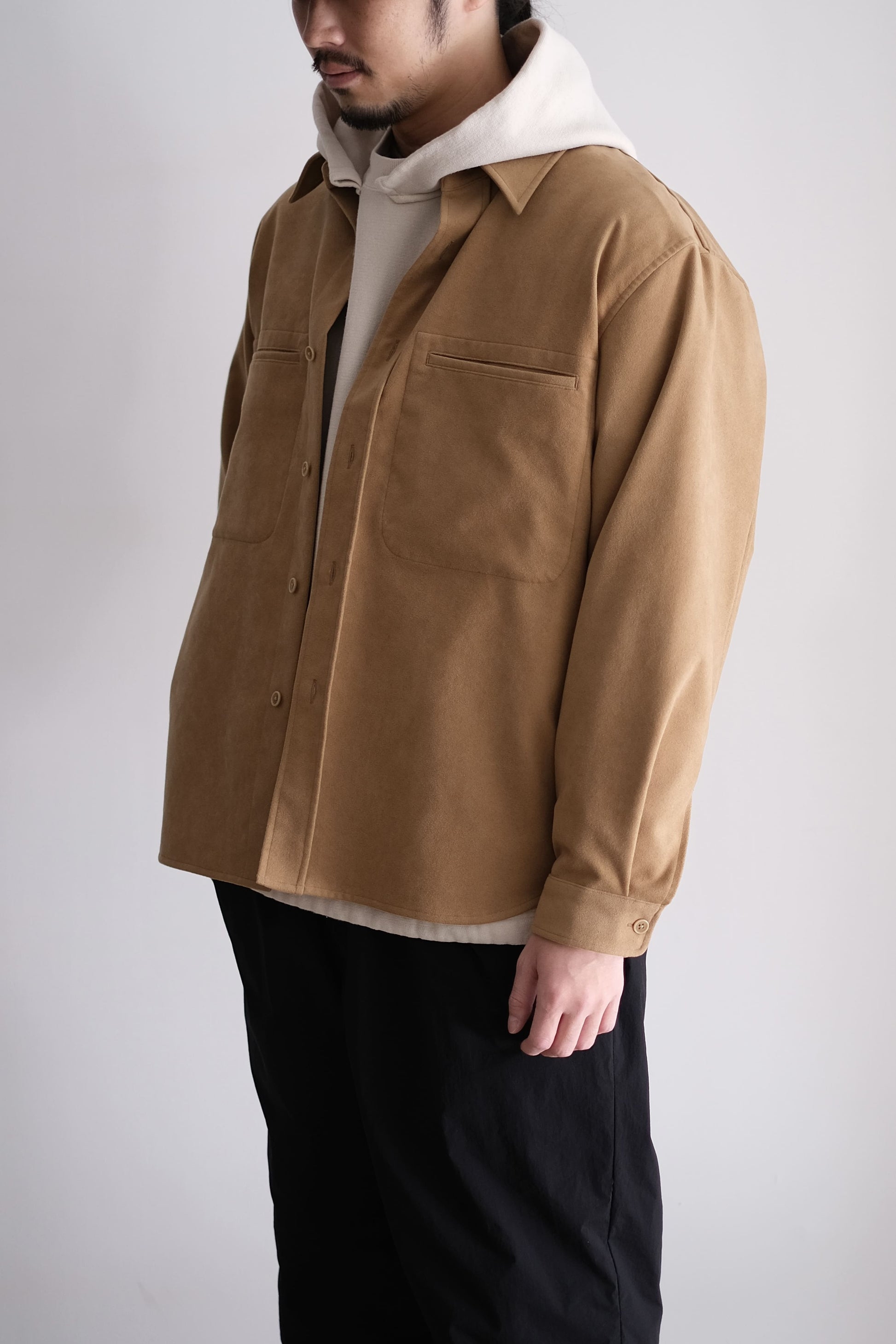フェイクスエード素材を使用したWポケットのシャツジャケット。シャツデザインですがしっかりとした素材感ですのでジャケットとしても活用いただけます。パッチポケットではなく玉縁ポケットにすることでカジュアルさを抑えたデザインに仕上げています。