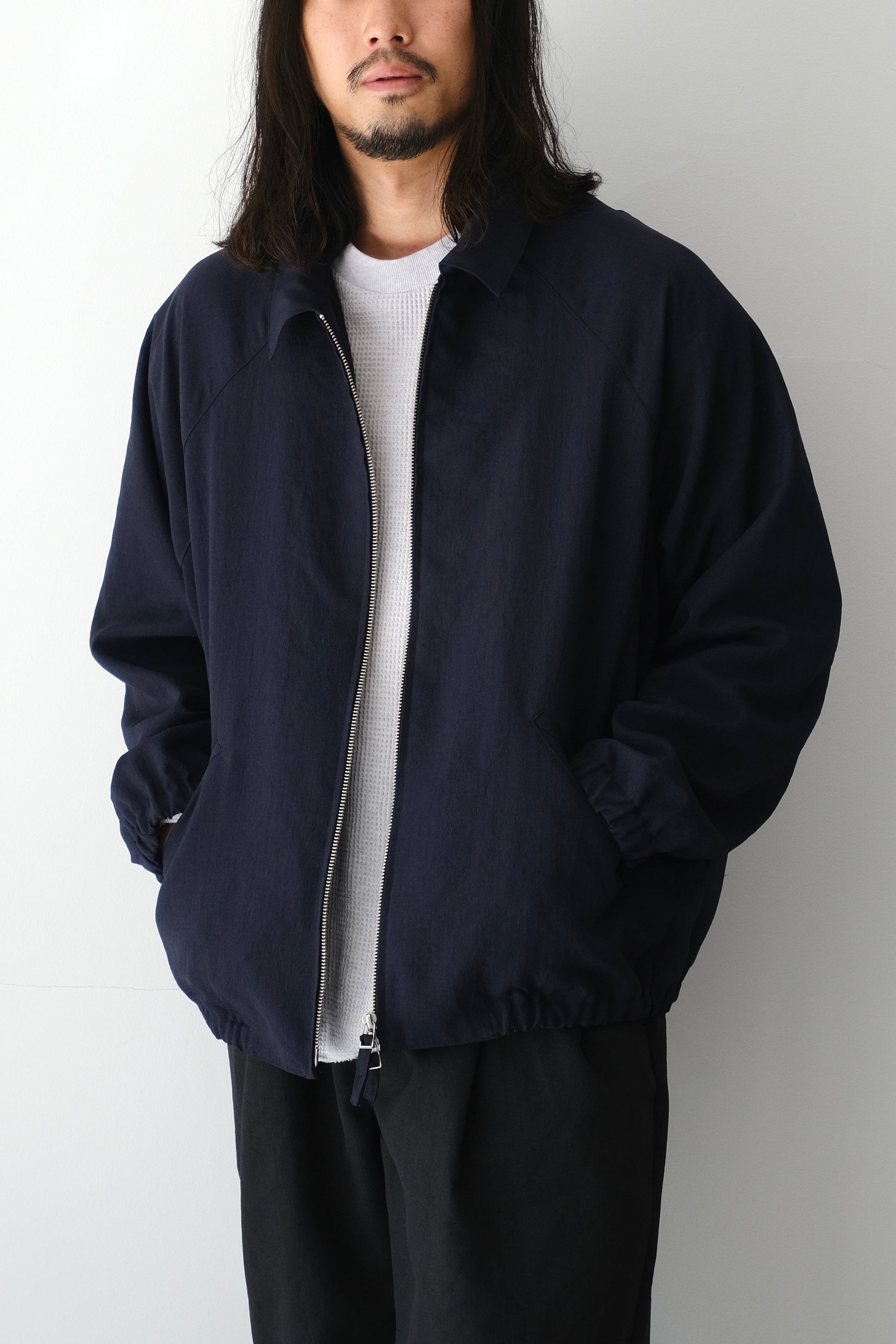 ラグランスリーブの切り替えラインに特徴があり、後ろからはセットインの様に見えるのが特徴のブルゾン。袖口に平ゴムを入れたディテールもポイントで気軽に袖捲りをして着られる気軽さのある雰囲気に仕上がりました。天然素材の様な見た目ですが、撥水性も兼ね備えております。